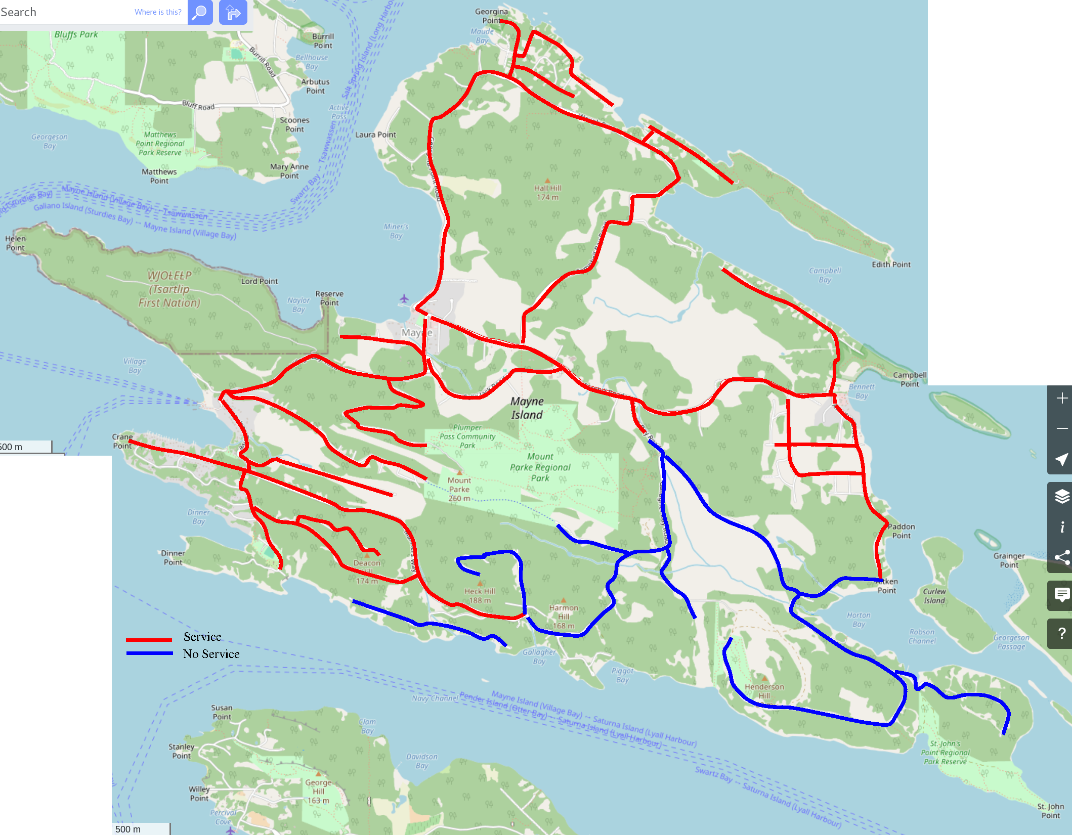 towers on Pender or Saturna islands. It needs line-of-sight to one of those.